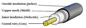 Core (inner conductor): sinle wire in thin cables. Two or more wires braided in thick cables for increased flexibility. materials = copper alloy, silver-plated copper alloy, copper-plated steel