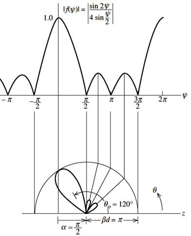 - 축방사 배열(endfire array): 배열의 주 빔이 배열 축 방향. 소자간 위상차 α = –βd (+z 축 방향으로 방사), α = βd (–z 축 방향으로 방사)