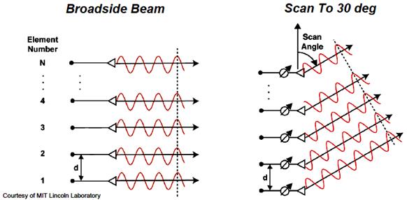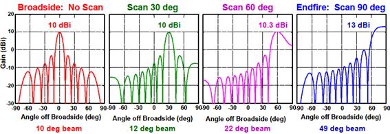 - 주사 배열(scanned array): 주 빔에 배열 축으로부터 θ0 만큼 scan된(tilt된) 배열. 소자간 위상차 α = –βdcosθ0
