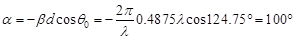 - 주 빔이 θ = 124.75º (배열 축에 수직인 broadside 방향(θ = 90º)에서 1번 소자 방향으로 34.75º 스캔)가 되려면 소자간 위상차 α가 다음 조건을 만족해야 한다.