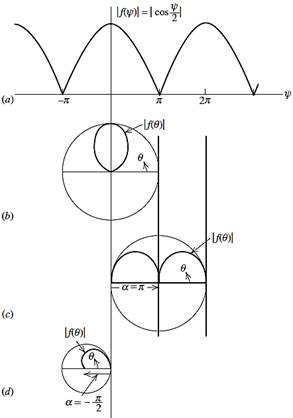 array. (b) d = 0.5λ, α = 0, (c) d = 0.5λ, α = π, (d) d = 0.25λ, α = –π/2