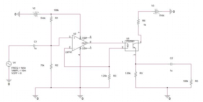 연산증폭기(LM741)의 비반전 입력핀 Vcc/2 전압이 걸림. 교류 audio input은 decoupling capacity를 통해 3번 핀에 연결된다. 3번 핀의 전압은 직류 Vcc/2에 교류가 더해진 전압이다. 광결합기의 DC 전류는 (Vcc/2)/R3로 주어지며 1-2mA로 설정한다. 광결합기 출력 트랜지스터 이미터에 연결된 RV1 가변저항을 조정하여 이미터 전압이 컬렉터 전압의 1/2이 되도록 한다. 광결합기 입력단 전류가 입력 교류신호에 의해 변조되면 광결합기 출력단 전류가 입력 교류신호에 의해 변조되고 이에 따라 출력 트랜지스터 이미터 전압이 변조되며 이중 교류성분이 C2를 통해 audio output 단자에 나타난다.