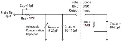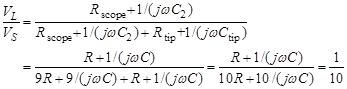 - 오실로스코프 프로브 선 (동축선)의 길이는 약1 m이며, 이것의 커패시턴스는 약100 pF이다. 100 pF가 오실로스코프의 20 pF와 병렬로 연결되어 RC 저역통과 필터로 작용