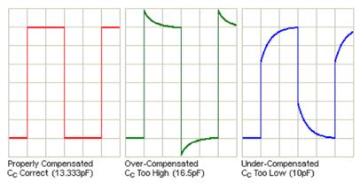 그림: 오실로스코프 보상 커패시턴스 값에 따른 측정된 펄스 파형